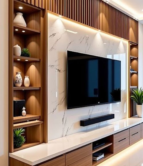 Our services include PVC wall panels, PVC ceiling panels, fluted panels, UV marble sheets, modular kitchen design, wardrobes, TV units, vinyl flooring, and decorative interior work.